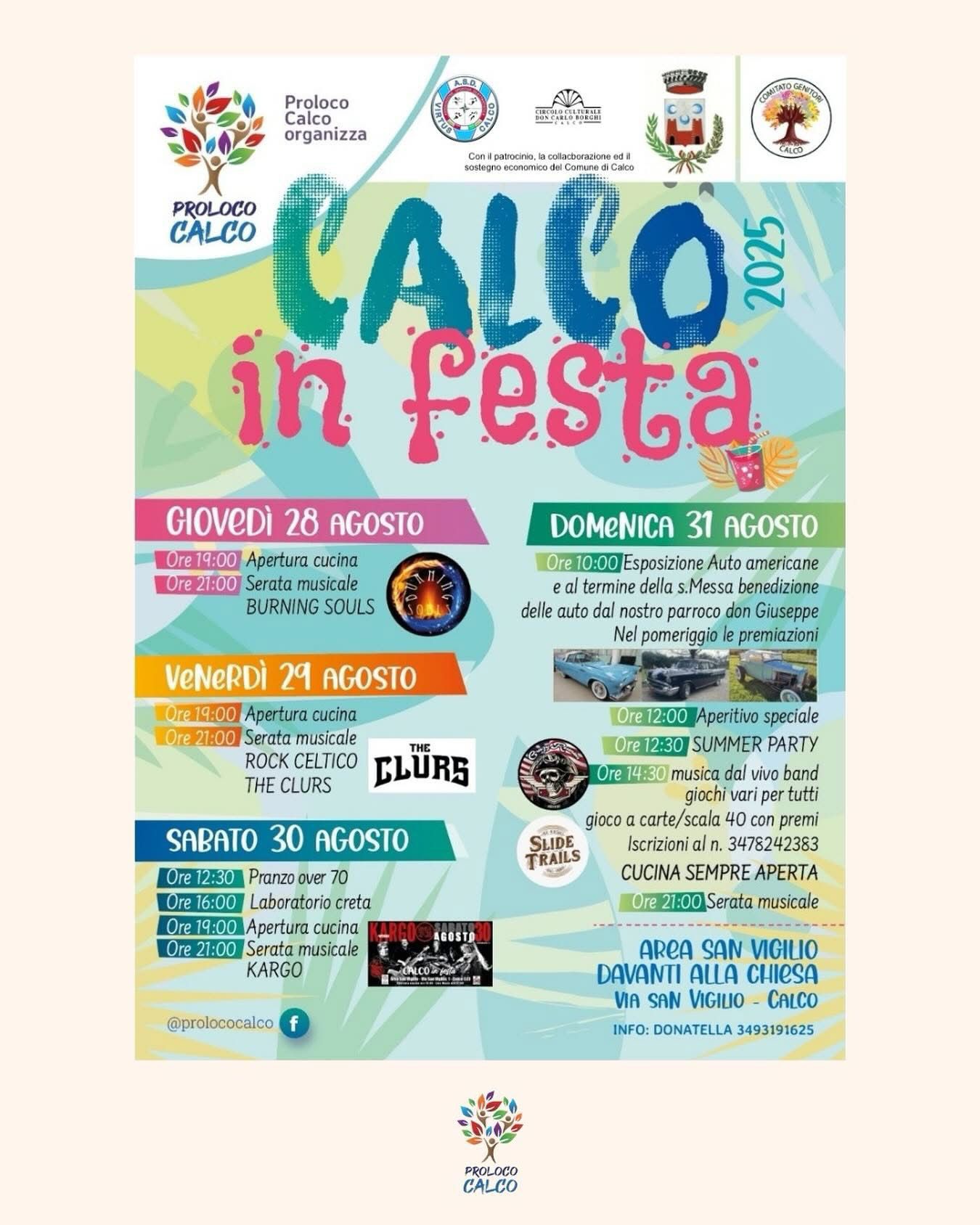 La Pro Loco ricorda poi l’appuntamento con “Calco in festa” dal 28 al 31 agosto, con cucina aperta tutte le sere dalle 19 con piatti della tradizione, specialità diversa ogni sera e musica dal vivo: il 28 “Burning Souls”, il 29 “The Clurs”, il 30 “Cargo”, il 31 il gran finale a sorpresa.