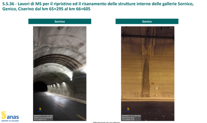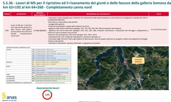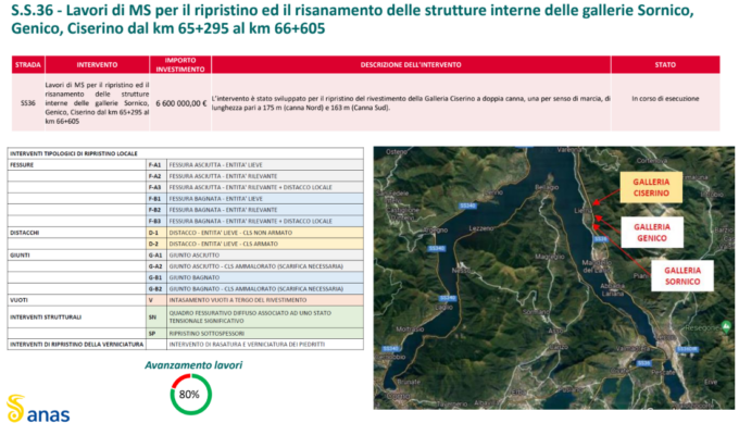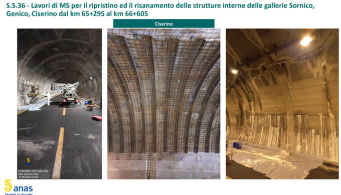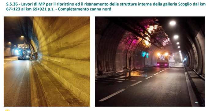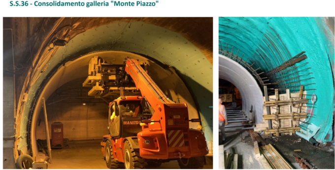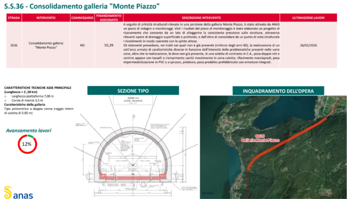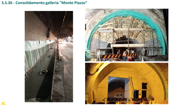 Altri lavori sono in corso sulla SS36 in particolare il consolidamento della Galleria Monte Piazzo (lavori eseguiti al 12%)