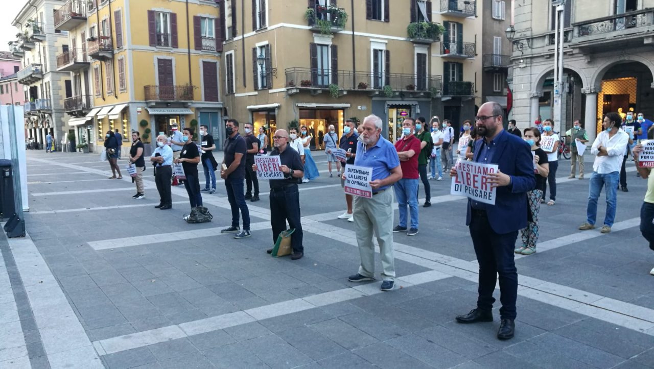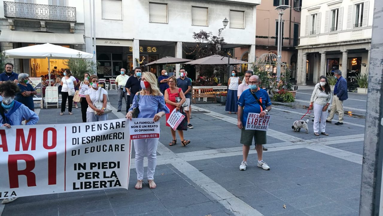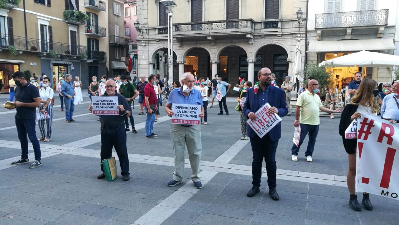 In piedi in piazza XX Settembre, distanziati e silenziosi, per dire no alla legge contro la omotransfobia (che ha l’obiettivo di fornire adeguati strumenti contro i cosiddetti “hate crimes” crimini d’odio, e vuole diffondere la cultura del rispetto e della tolleranza) considerata dai presenti “lesiva della libertà di espressione”. E’ stata una veglia, e al tempo stesso una manifestazione di protesta, quella andata in scena nella serata di oggi, giovedì 16 luglio a Lecco, davanti a Palazzo delle Paure. Ad organizzarla il movimento #resistiamoliberi. Presenti in piazza anche il candidato sindaco di Lecco Peppino Ciresa, in corsa per il centrodestra e il dirigente di Fratelli d’Italia ed ex consigliere comunale a Palazzo Bovara Giacomo Zamperini.