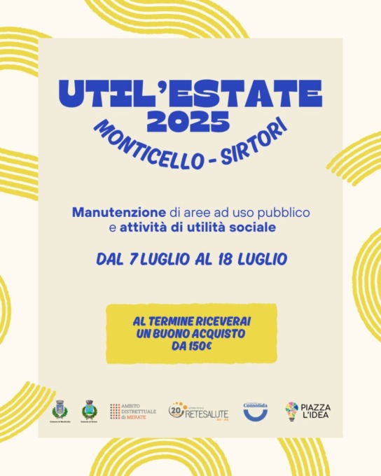 A Monticello sta per tornare Util’estate, l’ormai tradizione iniziativa rivolta a ragazzi nati fra il 2006 e il 2010. Il progetto andrà in scena dal 7 al 18 luglio e quest’anno punterà sulla manutenzione di aree ad uso pubblico e attività di utilità sociale. Al termine, i ragazzi riceveranno un buono acquisto da 150 euro da utilizzare in alcune realtà commerciali del territorio.