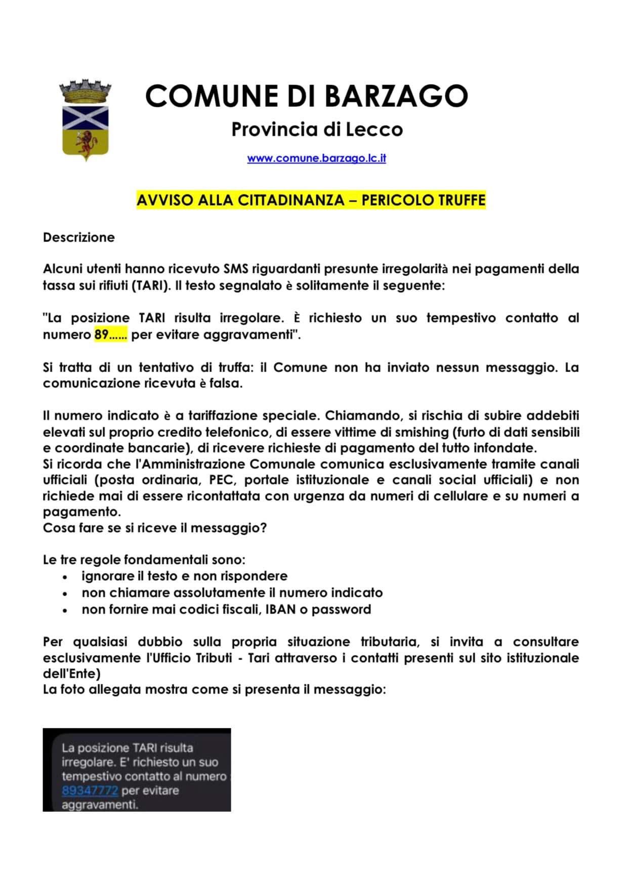 Sms falsi relativi a presunte irregolarità nel pagamento della Tari: questa la truffa telefonica che circola in questi giorni a Barzago; l’Amministrazione comunale invita quindi i cittadini a prestare la massima attenzione.