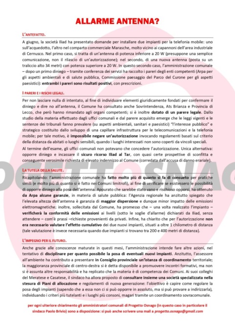 L’antenna 5G a Osnago continua a far discutere: dopo l’incontro di martedì sera con il Comitato Tutela Salute Pubblica, che sta portando avanti una battaglia per scongiurarne l’installazione, questa mattina, sabato 19 novembre, dalle 9.30 alle 12.30, il gruppo di maggioranza Progetto Osnago sarà in piazza Vittorio Emanuele per fare chiarezza su alcuni temi, fra cui proprio la tanto discussa antenna 5G.