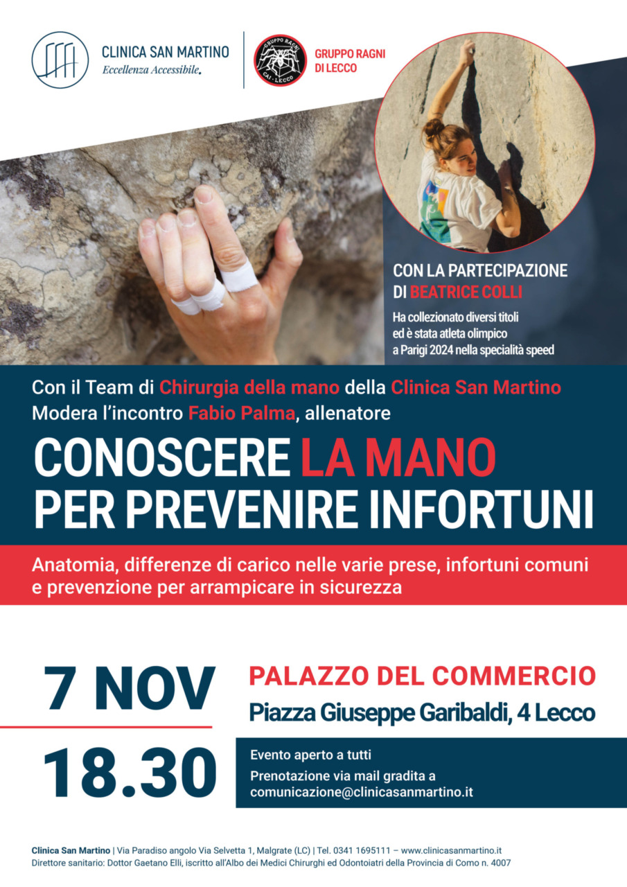 Clinica San Martino e Gruppo Ragni di Lecco organizzano un incontro pubblico dedicato alla prevenzione degli infortuni alla mano nell’arrampicata. L’appuntamento è fissato per venerdì 7 novembre alle 18:30 presso Palazzo del Commercio, in piazza Giuseppe Garibaldi 4. L’iniziativa si rivolge ad atleti, appassionati, fisioterapisti, allenatori e operatori del settore con l’obiettivo di approfondire gli aspetti anatomici e funzionali di una parte del corpo particolarmente sollecitata durante la pratica sportiva.