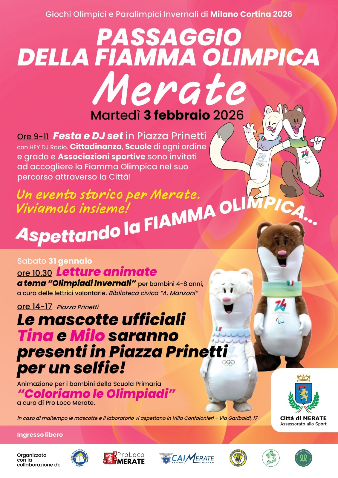 Nel pomeriggio, dalle 14 alle 17, piazza Prinetti accoglierà Tina e Milo, le mascotte ufficiali dei Giochi Olimpici e Paralimpici Invernali di Milano Cortina 2026, disponibili per foto e incontri con il pubblico.