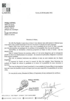 Con una lettera scritta prima in francese e poi tradotta in italiano, il sindaco di Carvin Philippe Kemel e il suo vice Alain Masson hanno voluto fare gli auguri di buon anno nuovo alla comunità di Carvico: