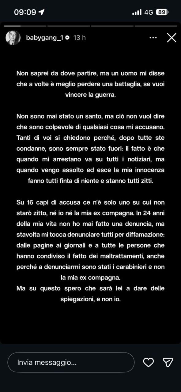 Ed è proprio quest’ultima accusa al centro delle dichiarazioni di Baby Gang che non solo cerca di difendersi, ma passa anche al contrattacco: “Non sono mai stato un santo, ma ciò non vuol dire che sono colpevole di qualsiasi cosa mi accusano. Tanti di voi si chiedono perché, dopo tutte queste condanne, sono sempre stato fuori: il fatto è che quando mi arrestano va su tutti i notiziari, ma quando vengo assolto ed esce la mia innocenza fanno tutti finta di niente e stanno tutti zitti. Su 16 capi d’accusa ce n’è solo uno su cui non starò zitto, né io né la mia ex compagna. In 24 anni della mia vita non ho mai fatto una denuncia, ma stavolta mi tocca denunciare tutti per diffamazione: dalle pagine ai giornali e a tutte le persone che hanno condiviso il fatto dei maltrattamenti, anche perché a denunciarmi sono stati i Carabinieri e non la mia ex compagna. Ma su questo spero che sarà lei a dare delle spiegazioni, e non io”.