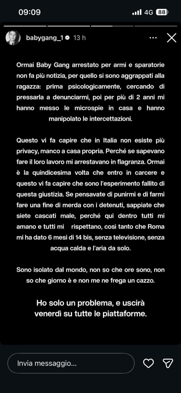 Ma è la chiusura dello sfogo che svela il vero motivo delle sue parole: “Sono isolato dal mondo, non so che ore sono, non so che giorno è e non me ne frega un caz… Ho solo un problema e uscita venerdì su tutte le piattaforme…”. Una trovata pubblicitaria per lanciare la sua nuova canzone quindi? Se è vero che il brano uscirà, è altrettanto vero che, al momento, Baby Gang rimane chiuso in carcere.