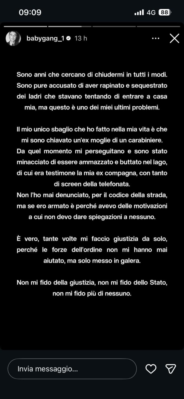 E Baby Gang va anche oltre: “Tante volte mi faccio giustizia da solo – scrive – perché le forze dell’ordine non mi hanno mai aiutato, mi hanno messo solo in galera. Non mi fido della giustizia, non mi fido dello Stato, non mi fido più di nessuno”.