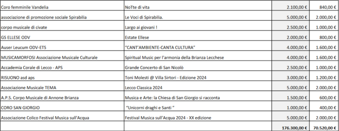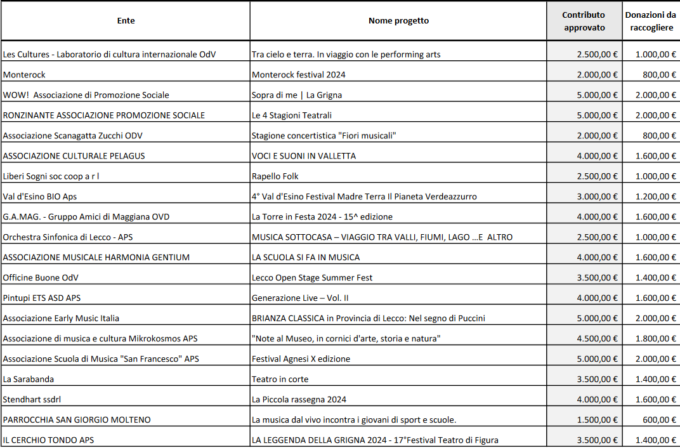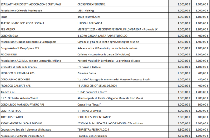 Sono 54 i progetti approvati dal Consiglio di amministrazione della Fondazione Comunitaria del Lecchese, in accordo con gli enti promotori del Fondo “Ambiente e cultura” (Acinque, Comuni soci di Lario Reti Holding e di Silea SpA, con il contributo delle BCC Brianza e Laghi, Carate Brianza, Valle del Lambro e Valsassina) sul Bando “Arti dal Vivo” 2024.