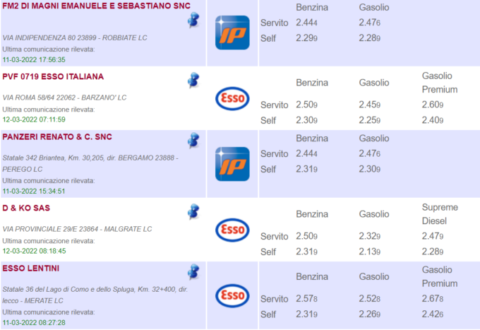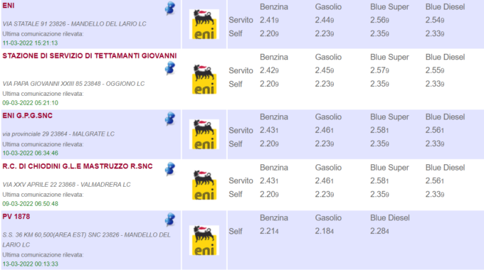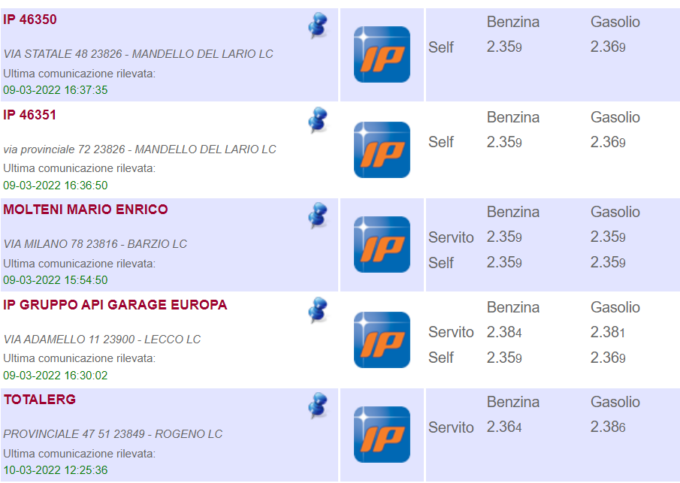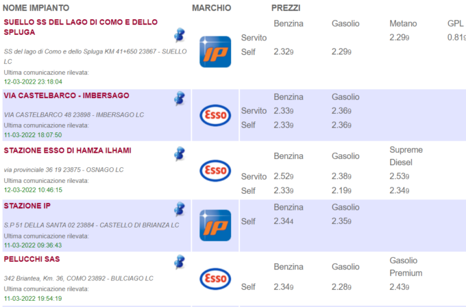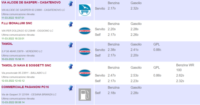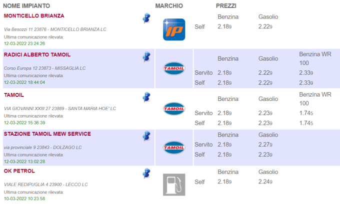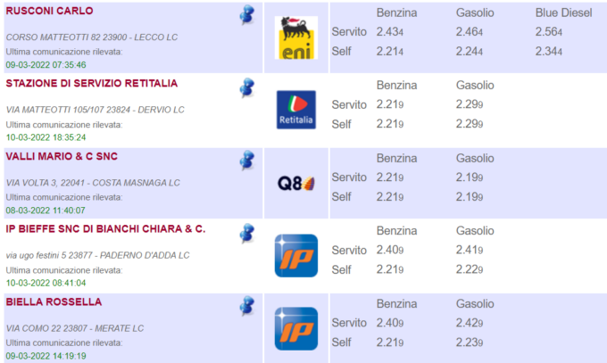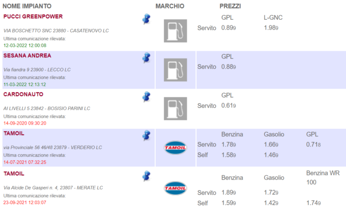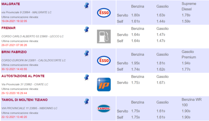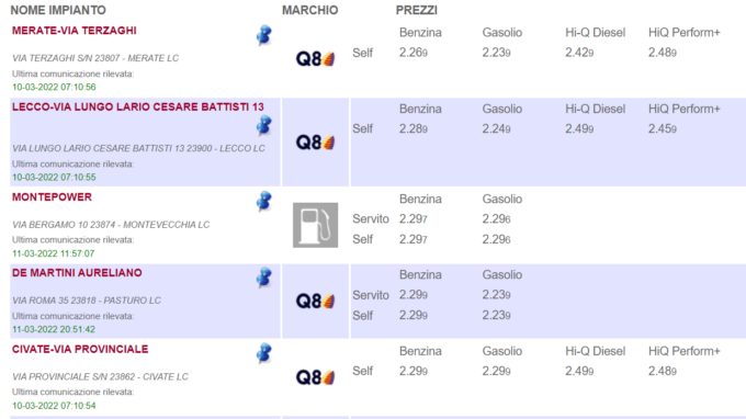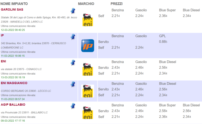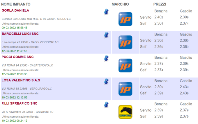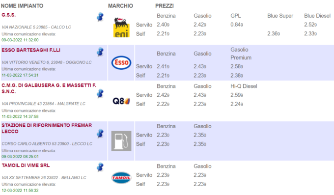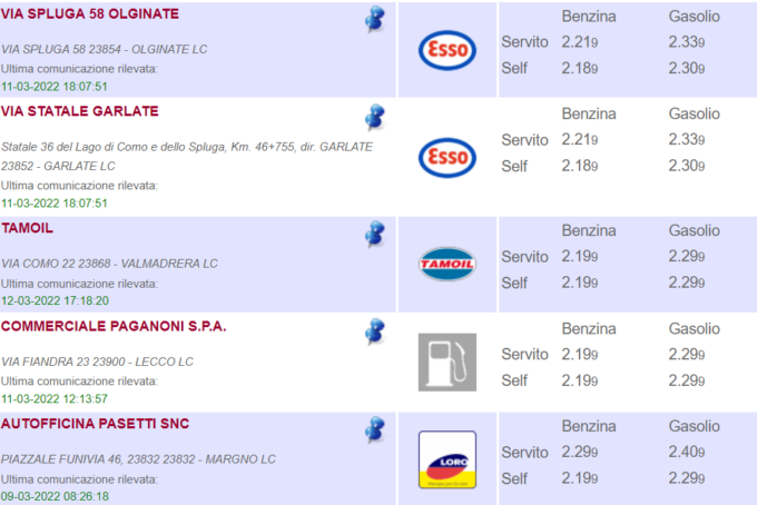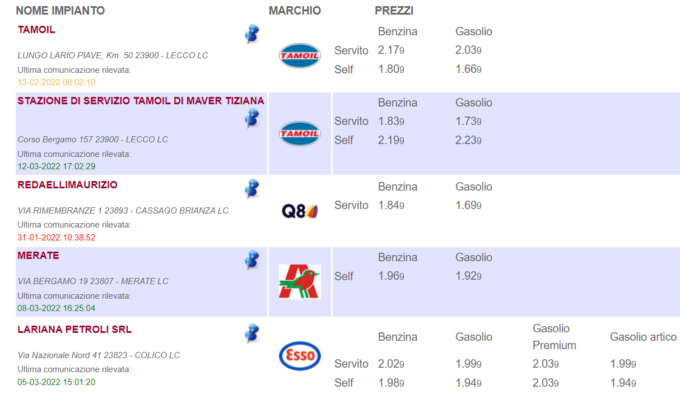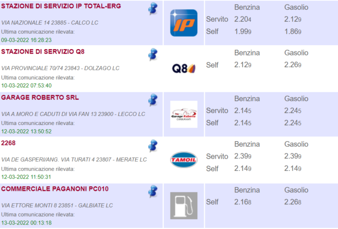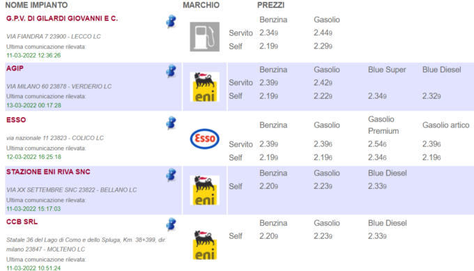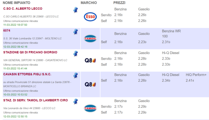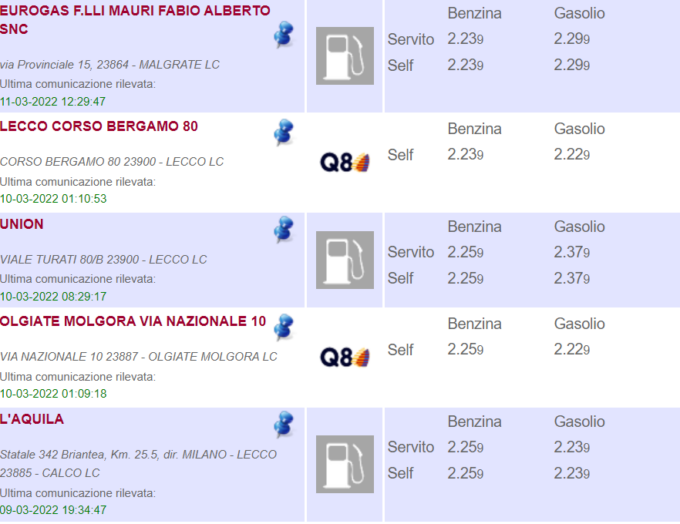 Ecco allora che abbiamo deciso di proporvi, anche questa settimana, a distanza di una decina di giorni dall’ultima rilevazione, l’elenco aggiornato di tutti i prezzi delle aree di servizio situate in tutta la provincia di Lecco. Si tratta delle rilevazioni effettuate da “Osservaprezzi carburanti”, portale del Ministero dello Sviluppo Economico con cui è possibile consultare i prezzi di vendita nelle pompe di benzina sparse su tutto il territorio nazionale.