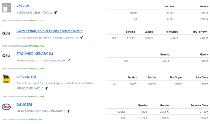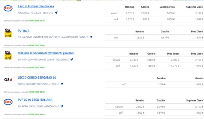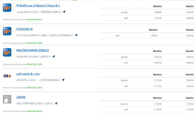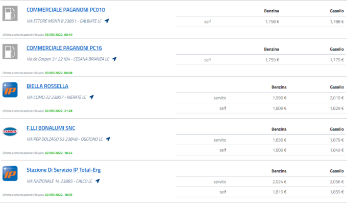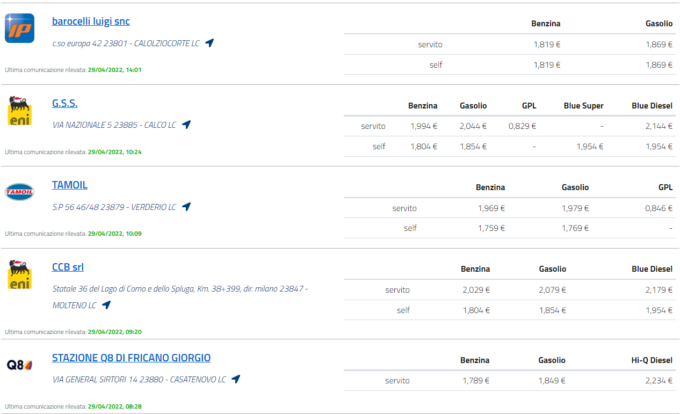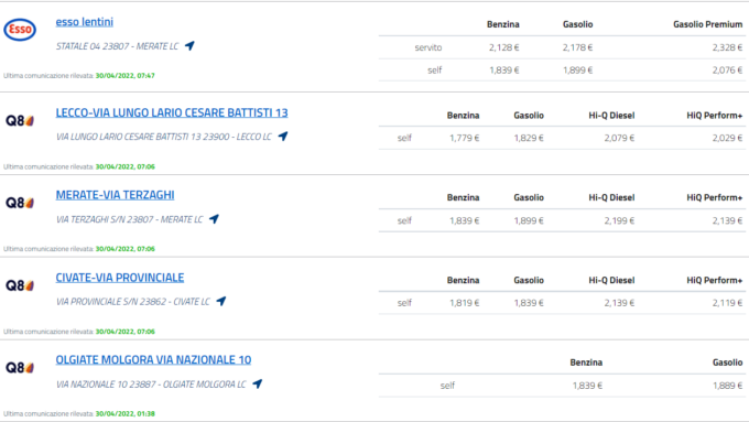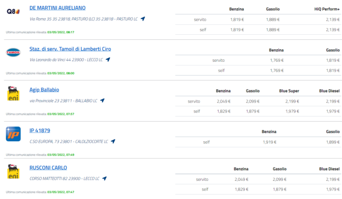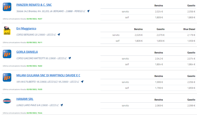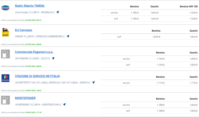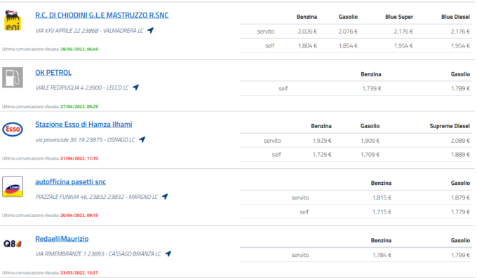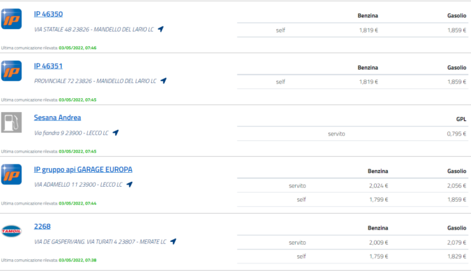 Ma vediamo la situazione a Lecco distributore per distributore (qui l’ultima rilevazione che vi abbiamo fornito). I prezzi che vi proponiamo come ormai di consueto, sono ordinati secondo l’ultimo aggiornamento. La fonte è “Osservaprezzi carburanti”, ovvero il sito del Ministero dello Sviluppo Economico che permette di consultare in tempo reale i prezzi di vendita dei carburanti praticati negli impianti di distribuzione situati nel territorio nazionale, così come comunicati dai gestori degli stessi punti di vendita settimanalmente o nei casi di aumenti infrasettimanali.