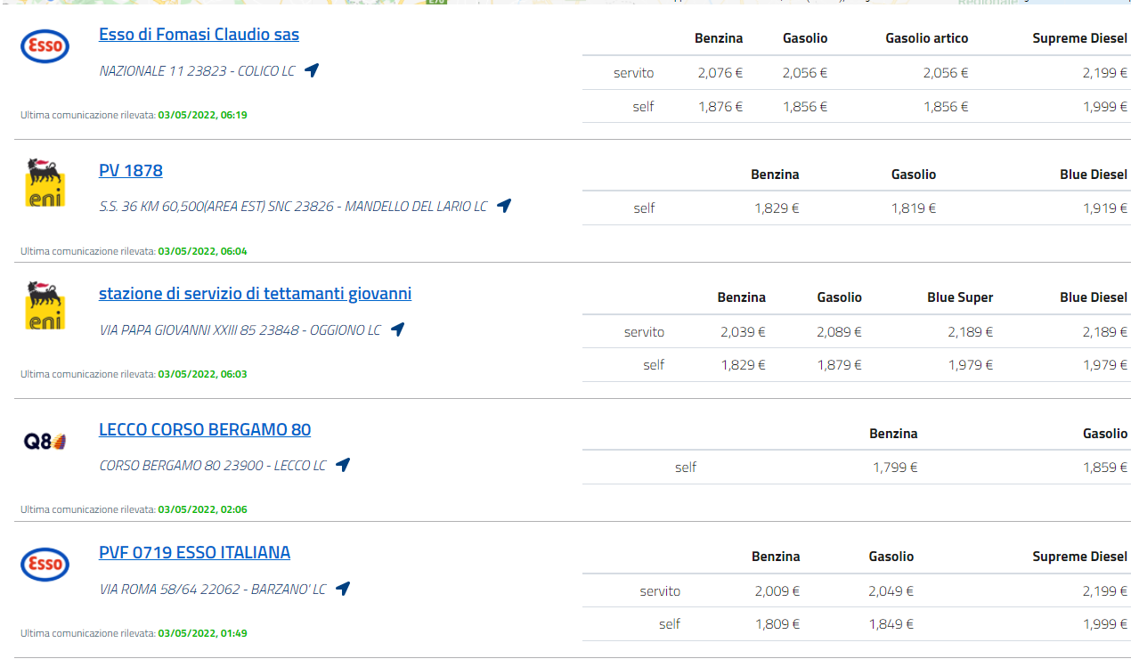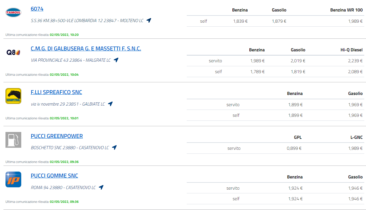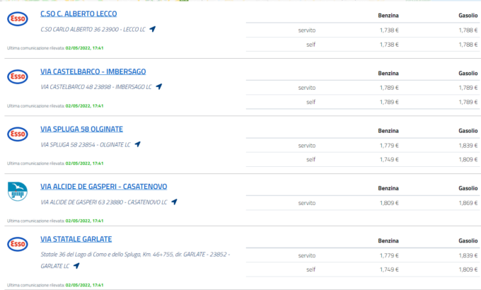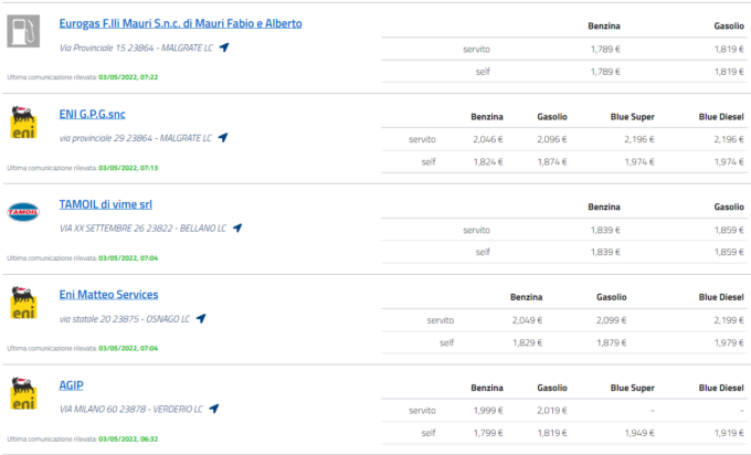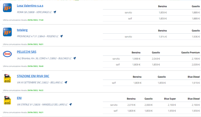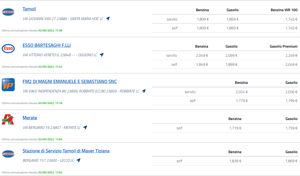Ma vediamo la situazione a Lecco distributore per distributore (qui l’ultima rilevazione che vi abbiamo fornito). I prezzi che vi proponiamo come ormai di consueto, sono ordinati secondo l’ultimo aggiornamento. La fonte è “Osservaprezzi carburanti”, ovvero il sito del Ministero dello Sviluppo Economico che permette di consultare in tempo reale i prezzi di vendita dei carburanti praticati negli impianti di distribuzione situati nel territorio nazionale, così come comunicati dai gestori degli stessi punti di vendita settimanalmente o nei casi di aumenti infrasettimanali.