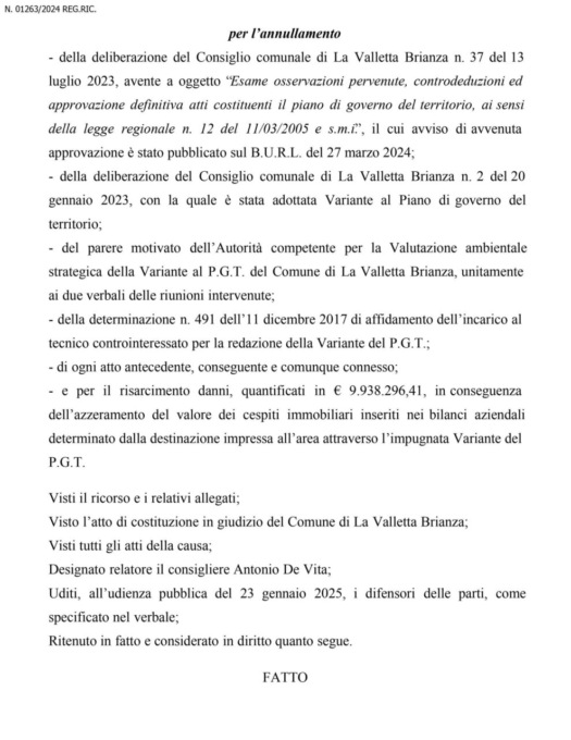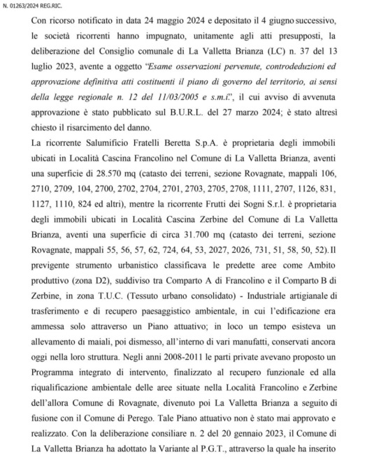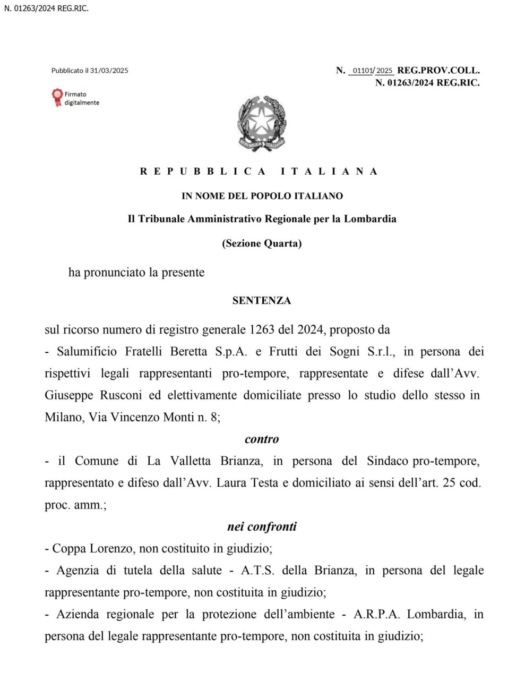 Il primo round del braccio di ferro tra il Salumificio Beretta e il Comune di La Valletta Brianza l’ha vinto quest’ultimo. Oggi, lunedì 31 marzo 2025, il Tar si è infatti pronunciato, in parte rigettando e dichiarando in parte inammissibile il ricorso presentato dall’azienda contro il Pgt approvato dall’Amministrazione di Marco Panzeri.