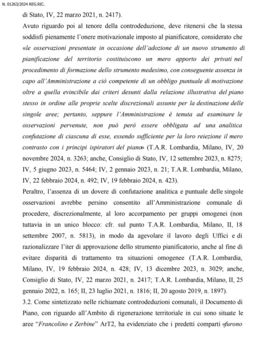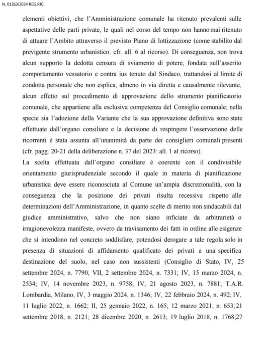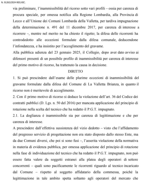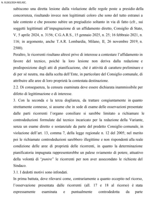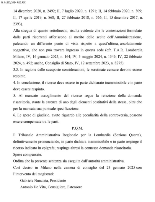 Di lì la scelta di ricorrere al Tar, con la sentenza di quest’oggi che dà ragione all’Amministrazione. “Il ricorso è stato in parte dichiarato inammissibile e in parte rigettato in quanto infondato nel merito: la sentenza conferma la legittimità e la correttezza dell’operato dell’Amministrazione comunale; è stata inoltre rigettata anche la domanda risarcitoria, ritenuta dallo stesso TAR priva di motivazione” ha commentato il sindaco Panzeri, pubblicando sulla pagina Facebook del Comune il testo integrale della sentenza.