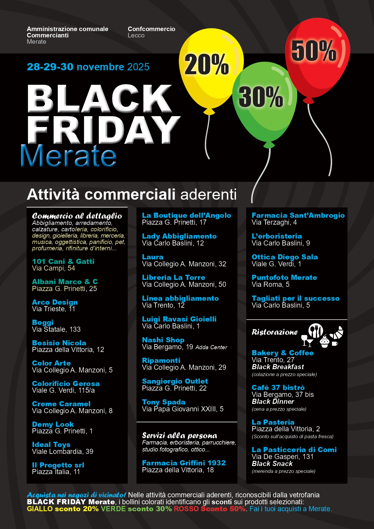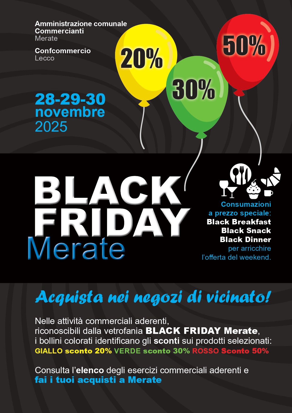 È tutto pronto per il primo «Black Friday Merate», l’iniziativa promossa dal Comune insieme ai commercianti e a Confcommercio Lecco, in programma nel fine settimana del 28, 29 e 30 novembre 2025.