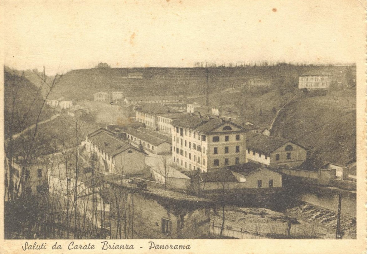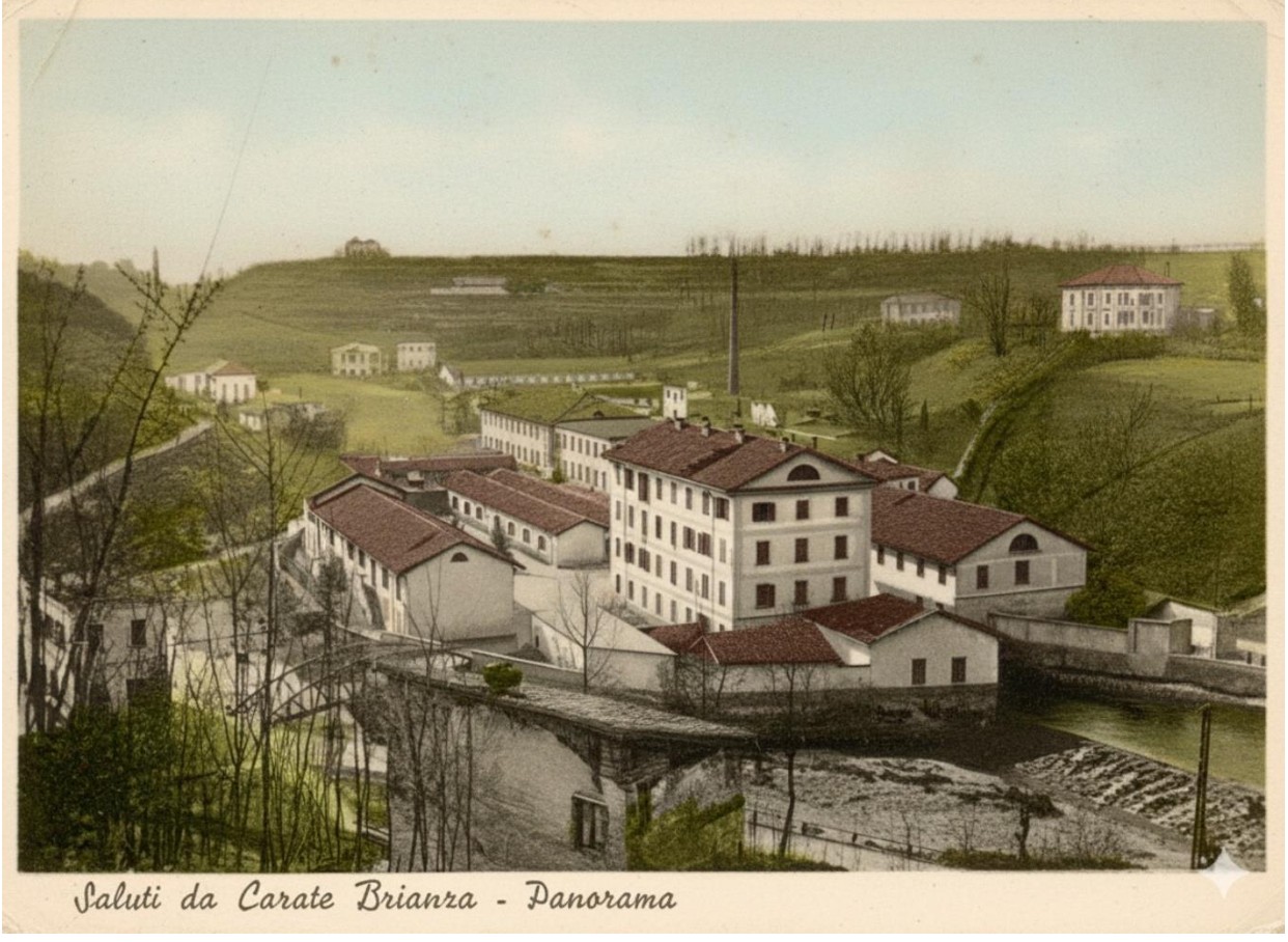 Lo storico triuggese Angelo Cecchetti ci riporta al lontano 1935. “Si tratta di un documento recentemente recuperato e, non essendo datato, non è indicata la data di stesura, con molta probabilità prima del 1935, come dalla cartolina riportata. Dal disegno si può notare subito la descrizione dell’abitato su fiume Lambro: Via comunale dell’isola ora Via Leonardo da Vinci; la presenza di ponticelli di attraversamento sui corsi d’acqua, ora scomparsi; il passaggio di acqua derivata dal Lambro all’interno dei due caseggiati principali per fornire energia alle ruote della manifattura.