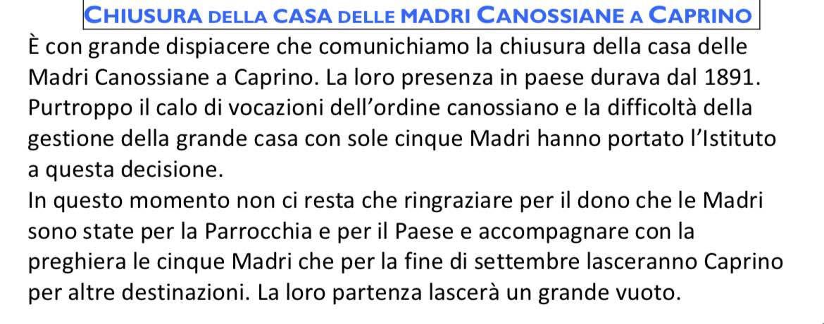 L’annuncio dato sugli avvisi settimanali della parrocchia di Caprino: “E’ con grande dispiacere che comunichiamo la chiusura della casa delle Madri Canossiane a Caprino. La loro presenza in paese durava dal 1891”, si legge infatti.