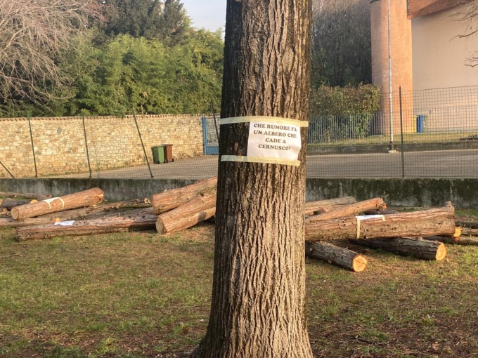 I messaggi sono apparsi nei giorni scorsi, in concomitanza con l’abbattimento di alcune essenze che erano state giudicate danneggiate o pericolose da parte dell’agronomo consultato dall’Amministrazione di Gennaro Toto. Cinque gli alberi che sono stati tagliati nei giorni scorsi, un Cupressus lawsonianae (specie non autoctona originaria del Nord America) e quattro pini. Sebbene l’Amministrazione abbia fatto sapere di voler sostituire le cinque essenze tagliate con altrettante giovani e in salute, alcuni cernuschesi, probabilmente legati a comitati ambientalisti che già in passato si erano schierati contro gli abbattimenti degli alberi in paese, hanno appeso dei cartelli ai tronchi per denunciare l’episodio.