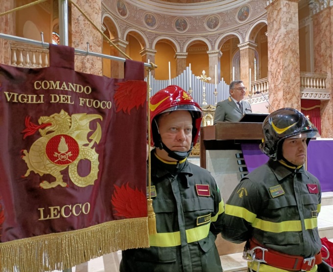 I pompieri lecchesi hanno reso omaggio oggi, lunedì 4 dicembre 2023 alla loro patrona, Santa Barbara, protettrice dei Vigili del Fuoco. Lo hanno fatto con una articolata cerimonia iniziata nella caserma di Piazza Bione dove sono stati ricordati tutti i pompieri caduti e proseguita poi nella Basilica di San Nicolò dove monsignor Davide Milani, con don Andrea Lotterio, ha celebrato la messa. Erano presenti il prefetto, Sergio Pomponio,il questore Ottavio Aragona il vice sindaco di Lecco Simona Piazza ,il consigliere regionale Giacomo Zamperini, il consigliere provinciale Carlo Malugani la direttrice delle carceri di Pescarenico Antonina D’Onofrio e diversi sindaci del territorio.