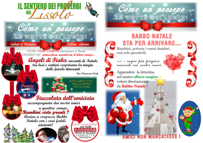 Oltre mille lumini illumineranno il borgo creando un’atmosfera natalizia d’altri tempi. Angoli di fiaba in cui tra racconti di Natale luci e sentieri verrà scoperta la magia delle favole itineranti. In programma la Fiaccolata dell’amicizia, in cui accompagnati anche dalle piccole zampette i bambini potranno assistere all’arrivo a sorpresa di babbo Natale e dei suoi fedeli aiutanti.