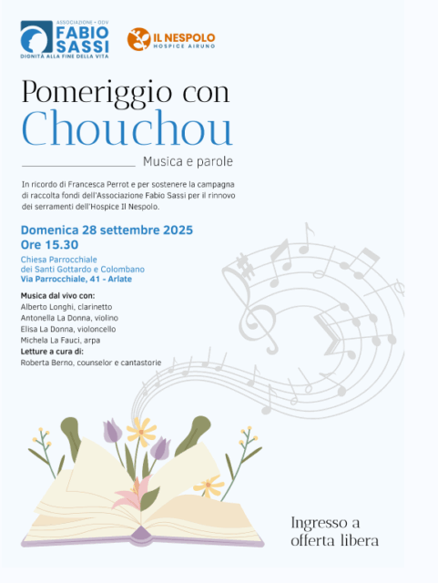L’ingresso sarà a offerta libera e il ricavato contribuirà alla campagna di raccolta fondi promossa dall’Associazione Fabio Sassi per il rinnovo dei serramenti dell’Hospice Il Nespolo di Airuno. Un progetto importante per rendere gli spazi della struttura più luminosi e accoglienti, in linea con la missione che da sempre guida l’Associazione: offrire un luogo di cura e di accompagnamento dignitoso e sereno, fino alla fine. “Pomeriggio con Chouchou” non è solo un concerto, ma un gesto d’amore: il ricordo di Francesca che si trasforma in sostegno concreto per chi oggi attraversa gli ultimi tratti della vita, unendo arte, solidarietà e comunità sotto la stessa luce.
