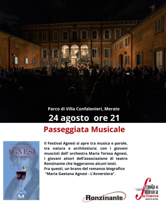 Domenica, 24 agosto, il Festival Agnesi si apre tra musica e parole, tra natura e architettura: con i giovani musicisti dell’ orchestra Maria Teresa Agnesi, i giovani attori dell’associazione di teatro Ronzinante che leggeranno alcuni testi. Fra questi, un brano del romanzo biografico “Maria Gaetana Agnesi – L’Avversiera”. Ambientato nella villa Agnesi di Montevecchia nell’autunno del 1798, il romanzo finge un incontro fra Maria Gaetana Agnesi e Giuseppe Parisi per raccontare, insieme alla vita di questi due personaggi, il vivace ambiente milanese del settecento.