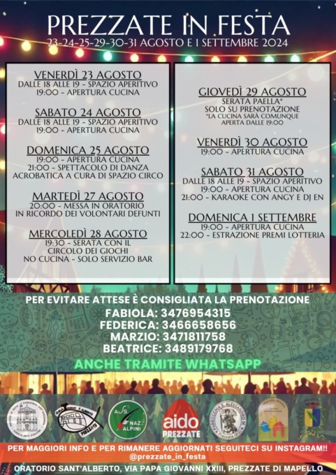 Anche quest’anno torna Prezzate in Festa, l’atteso appuntamento estivo che animerà la comunità di Prezzate di Mapello con serate di convivialità, buon cibo e intrattenimento. L’edizione 2025 si svolgerà nei fine settimana del 22-23-24 e 28-29-30-31 agosto, presso l’Oratorio Sant’Alberto in via Papa Giovanni XXIII.