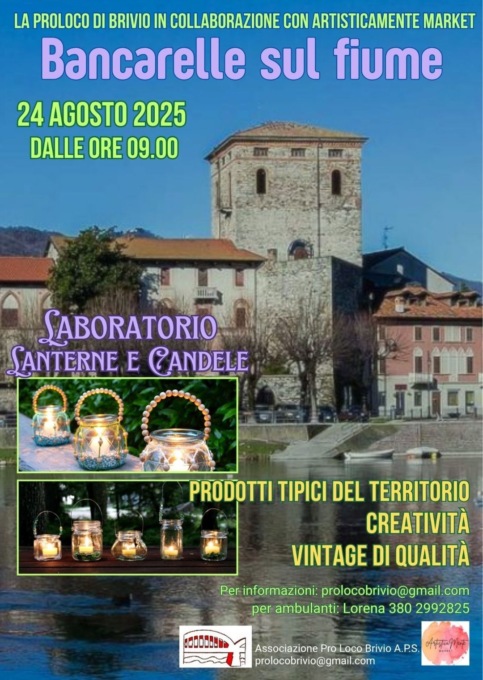 Tornano le bancarelle sul fiume a Brivio: l’appuntamento con la tradizionale iniziativa è per il 24 agosto dalle 9. Saranno presenti tanti stand con prodotti tipici del territorio, creatività e vintage, con in programma anche un laboratorio di candele e lanterne. L’iniziativa è organizzata da Pro Loco, per maggiori informazioni scrivere a prolocobrivio@gmail.com. Gli ambulanti interessati a partecipare possono contattare invece Lorena al 380.2992825.