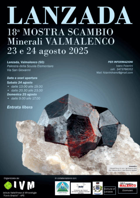 Sabato 23 e domenica 24 agosto 2025 la Mostra di Scambio Minerali Valmalenco è un evento annuale dedicato agli appassionati di mineralogia, ai collezionisti e a chiunque desideri approfondire la propria conoscenza riguardo ai minerali e alle gemme. Durante la mostra, espositori provenienti da diverse regioni d’Italia e dall’estero presentano una vasta gamma di minerali, dalle specie più rare ai pezzi più comuni, permettendo il confronto e scambi tra collezionisti.