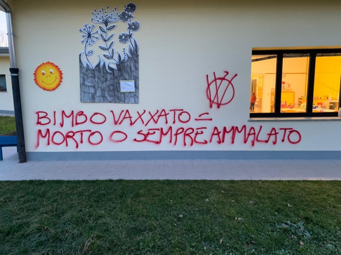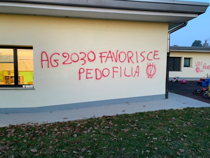 “Ag2020 favorisce pedofilia”. E ancora “Oms fa insegnare sesso ai bimbi e voi approvate? e “Bimbo vaxxato morto o sempre ammalato”. Questo il tenore delle frasi scritte dai vandali no vax nella notte appena trascorsa sui muri esterni della scuola dell’infanzia.
