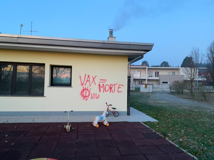 Un episodio gravissimo, firmato dai soliti vandali no vax che si sono resi protagonisti di numerosi episodi a Merate e nei paesi del circondario. Questa mattina sono comparse alcune frasi deliranti, con la solita vernice spray rossa e la doppia V come firma, sui muri esterni dell’asilo della frazione di Sartirana.