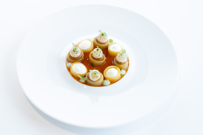 Una Stella Michelin a una cucina fortemente identitaria e personale, di grande impatto estetico e di ricerca costante del gusto in ogni piatto. Un’identità culinaria marcata che lavora sui concetti di essenzialità, estetica del gusto e valorizzazione dell’elemento vegetale con grande eleganza e rigore.