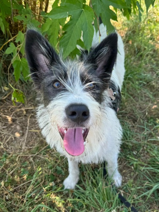 Piperita è una splendida meticcia dal pelo duro bianco e grigio, orecchie a punta e sguardo da furbetta. È nata presumibilmente a fine 2023 ed è stata accalappiata a Usmate Velate dopo che ne era stata segnalata la presenza in una casa disabitata.