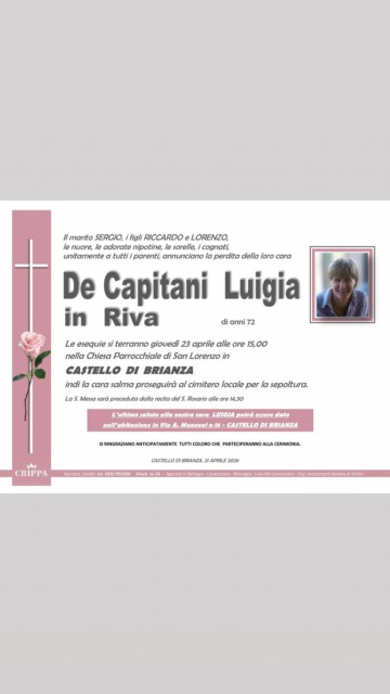 Il funerale di Luigina De Capitani verrà celebrato giovedì alle 15 nella chiesa parrocchiale di San Lorenzo a Castello Brianza.