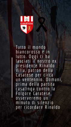 Oggi la Casatese, che giocherà nel campionato di Serie D dove guida la classifica del girone B, scenderà in campo contro la Folgore Caratese con il lutto al braccio.