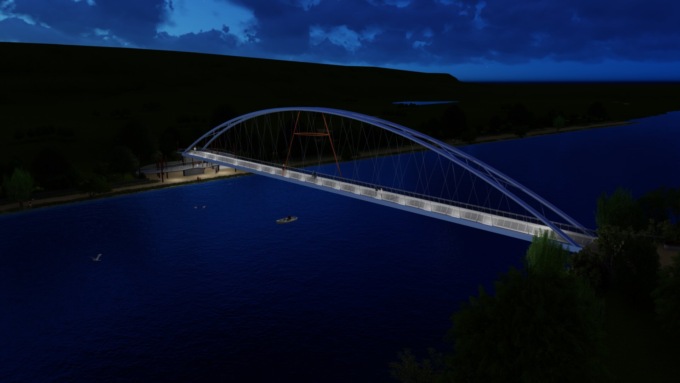 • Ponte in acciaio ad archi calandrati a curvatura continua con sistema di apprensione dell’impalcato tramite piedini