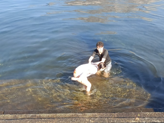 Il sole c'era, ma la temperatura dell'acqua è tutt'altro che invitante. Eppure nella mattinata di oggi, giovedì 20 marzo 2025, due giovani hanno compiuto questa simpatica impresa