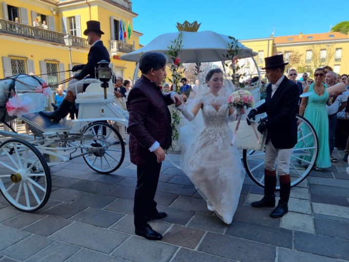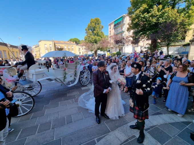 Splendida la sposa, in un elegantissimo abito bianco, giunta con il canonico quarto d’ora di ritardo, scesa in piazza a bordo di una carrozza bianca trainata da cavalli, insieme ai genitori. A precederla, un gruppo di suonatori di cornamuse scozzesi, rigorosamente in kilt.