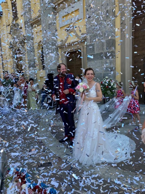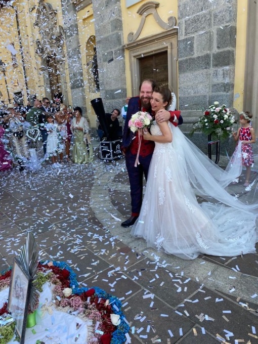 Grande la commozione degli sposi durante lo scambio degli anelli, l’uscita dalla chiesa è stata un tripudio di coriandoli, abbracci e applausi per i novelli sposi.