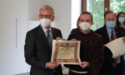 Infine onorificenza anche due romani, il cavalierato a Paolo Cancelli e la nomina a ufficiale per padre Stefano Cecchin, rispettivamente Direttore responsabile per i rapporti diplomatici della Pontificia Accademia Mariana Internazionale, e frate minore della Provincia veneta di Sant’Antonio da Padova, massimo studioso di mariologia a livello mondiale e presidente della Pontificia Accademia Mariana Internazionale. Ad accompagnare questi ultimi due benemeriti il lecchese Adriano Stasi, studioso di Mariologia chiamato lo scorso novembre a far parte del Dipartimento di analisi, studio e monitoraggio dei fenomeni criminali e mafiosi istituito dalla stessa Accademia. Frate Cecchin ha colto l’occasione per omaggiare con una medaglia la direttrice del carcere di Pescarenico, Antonina D’Onofrio e lo stesso Stasi, e consegnare al prefetto Castrese de Rosa la pergamena di socio onorario dell’Accademia.