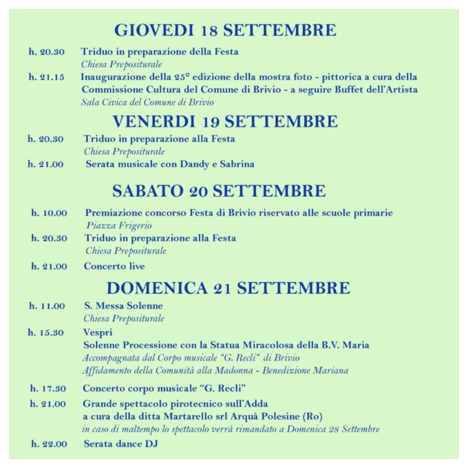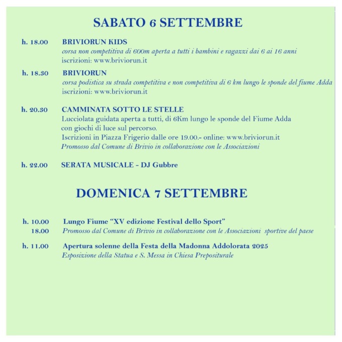 Il primissimo appuntamento della festa è previsto già sabato 6 settembre 2025 con la Brivio Run, che sarà preceduta dalla corsa dei bambini e che sarà poi seguita, in serata, dalla Camminata sotto le stelle e dal dj set.