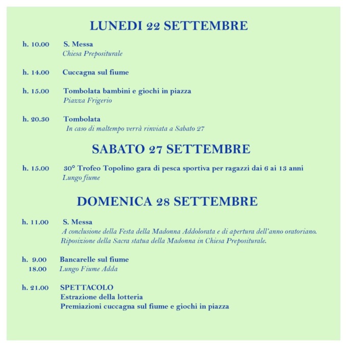 L’apertura solenne della festa della Madonna Addolorata, dal punto di vista religioso, avverrà domenica 7 settembre con la Messa delle 11. Da lì sarà poi un susseguirsi di appuntamenti, che vanno dal Festival dello sport alla degustazione di vini locali, dai giochi di una volta alle mostre fotografiche, fino ad arrivare a domenica 21 settembre con la tradizionale processione del pomeriggio, le bancarelle sul fiume e lo spettacolo pirotecnico.