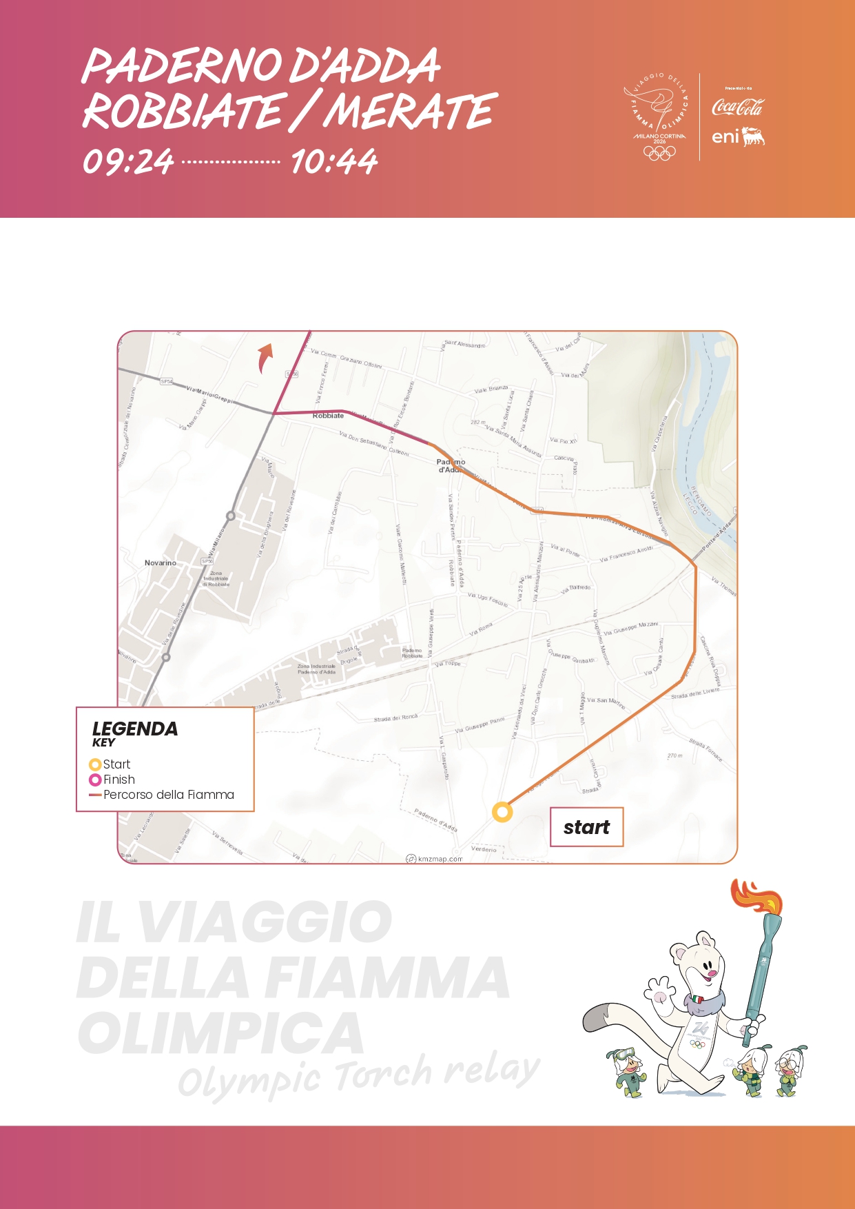 La fiaccola, nel tratto che riguarda il nostro territorio, partirà alle 9.24 dalla rotonda tra via Gasparotto a Paderno e via dei Contadini Verderesi a Verderio. Quindi partirà alla volta del ponte San Michele, proseguirà per Robbiate, Novate, per il centro di Merate e infine arriverà in viale Verdi.