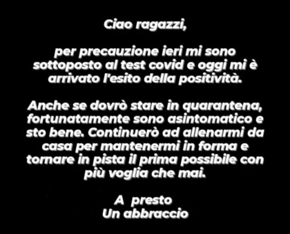 Tortu ha comunicato la sua positività quest’oggi, mercoledì 29 dicembre, con un post affidato ai social. “Ciao ragazzi, per precauzione ieri mi sono sottoposto al test Covid e oggi mi è arrivato l’esito della positività – ha scritto il campione caratese – Fortunatamente sono asintomatico e sto bene. Continuerò ad allenarmi da casa per tornare in pista il prima possibile e con più voglia che mai”.