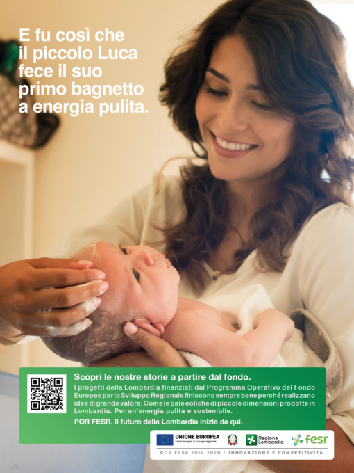 Avere a disposizione energia pulita che ci permetta di svolgere tutte le attività quotidiane, come fare un bel bagnetto caldo ai nostri bambini? Questo è possibile grazie alle pale eoliche di piccole dimensioni prodotte in Lombardia, un progetto sostenuto dal Programma Operativo Regionale del Fondo Europeo per lo Sviluppo Regionale e che garantisce un’energia più pulita e un futuro più sostenibile.
