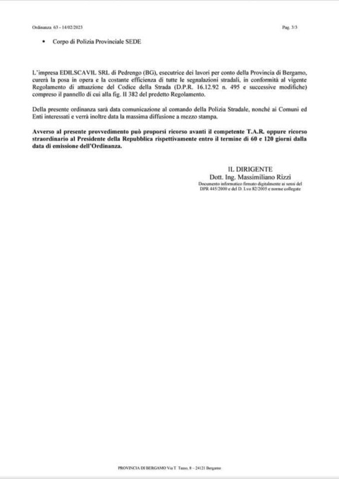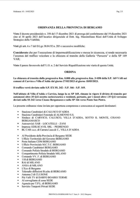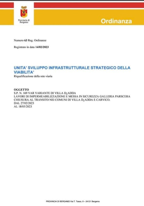 “La chiusura si rende necessaria per la realizzazione di un intervento straordinario di impermeabilizzazione e messa in sicurezza della sede stradale – si legge nel testo dell’ordinanza della Provincia – Nell’abitato di Villa d’Adda e Carvico, lungo la ex SP 169, rimane in vigore il divieto di transito per automezzi oltre 3,5t eccetto carico/scarico e residenti; pertanto, tutti i mezzi pesanti verranno deviati sulla SS 342 verso Cisano Bergamasco e sulla SP 166 verso Ponte San Pietro”.