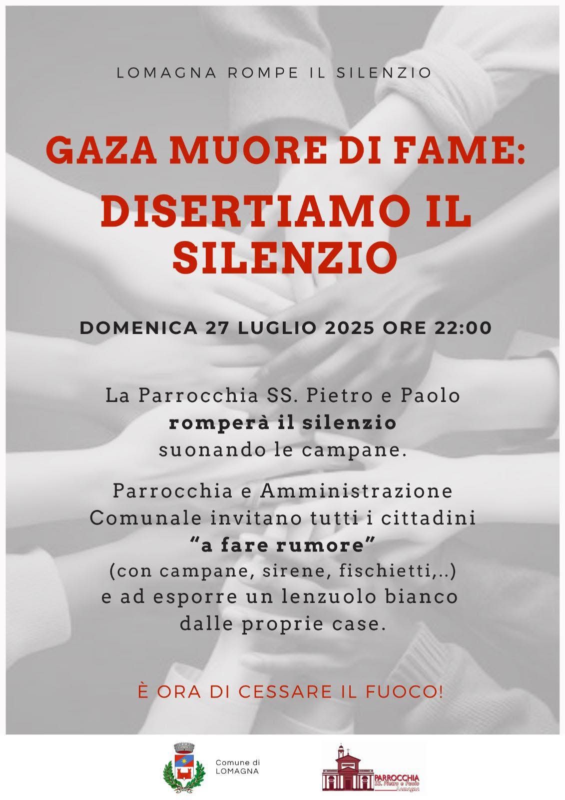Lomagna rompe il silenzio attorno alla situazione di grave crisi umanitaria in cui riversa la popolazione di Gaza. Anche il Comune di Lomagna e la parrocchia aderiscono infatti all’iniziativa “Disertiamo il silenzio” per far uscire la strage di Gaza dall’indifferenza del mondo.