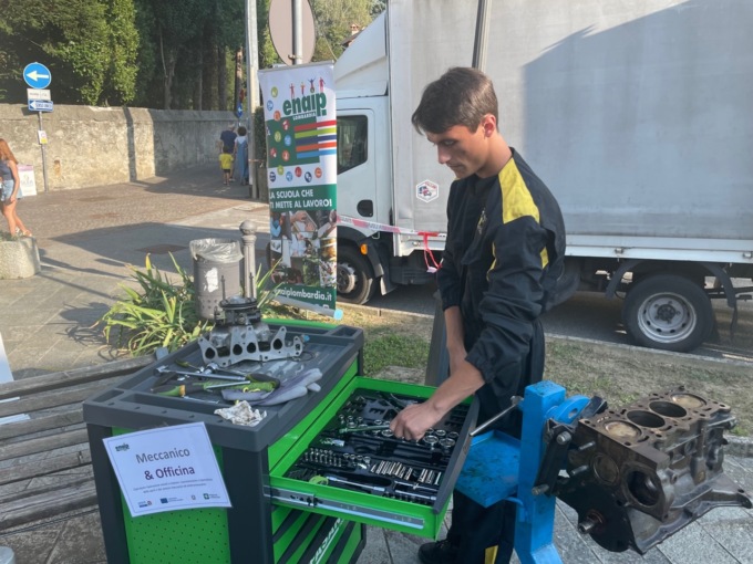Le allieve e gli allievi di Enaip, accompagnati da professoresse e professori, hanno allestito nel contesto della Piazza Pierius una vera e propria scuola a cielo aperto: cofani, portiere e altre parti di auto da sistemare per i carrozzieri; officina, motori e cambio gomme per i meccanici; circuiti e elettrici e componenti elettronici e industria 4.0 per gli elettricisti; bancone da lavoro e forno per panettieri che hanno sfornato senza sosta Larianelle e Matitini, ovvero il pane a forma di Lago e i grissini che ricordano il campanile lecchese, due prodotti ideati dagli studenti Enaip; fiori da invasare per gli operatori agricoli e florovivaisti.e allieve e gli allievi Enaip hanno quindi svolto vere e proprie dimostrazioni delle loro attività e delle loro professioni, spiegando anche i trucchi del mestiere, a favore dei passanti e di ragazze e ragazzi, e anche di piccini, che si fermavano curiosi e attenti davanti a tanta maestria ed entusiasmo, accolti dalle allieve e dagli allievi del corso turistico e sportivo di Enaip. Attrazione delle due giornate alcune auto di alta gamma presenti allo stand: i carrozzieri Enaip hanno “tirato a lucido” una Ferrari, una Lotus, una Alfa Romeo 4C e una 128, segno che le competenze degli studenti Enaip hanno raggiunto livelli importanti. Le due giornate sono state anche l’occasione per parlare del corso IFTS su automotive in partenza a ottobre: un corso innovativo, che completa e innalza il livello dell’offerta formativa di Enaip.