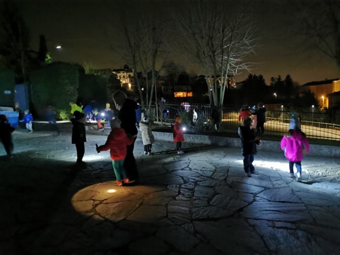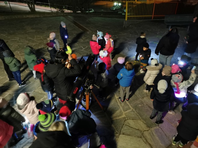 Torce e telescopio alla mano, i bimbi dell'infanzia di Lomaniga si sono infatti radunati in giardino per scoprire il cielo notturno