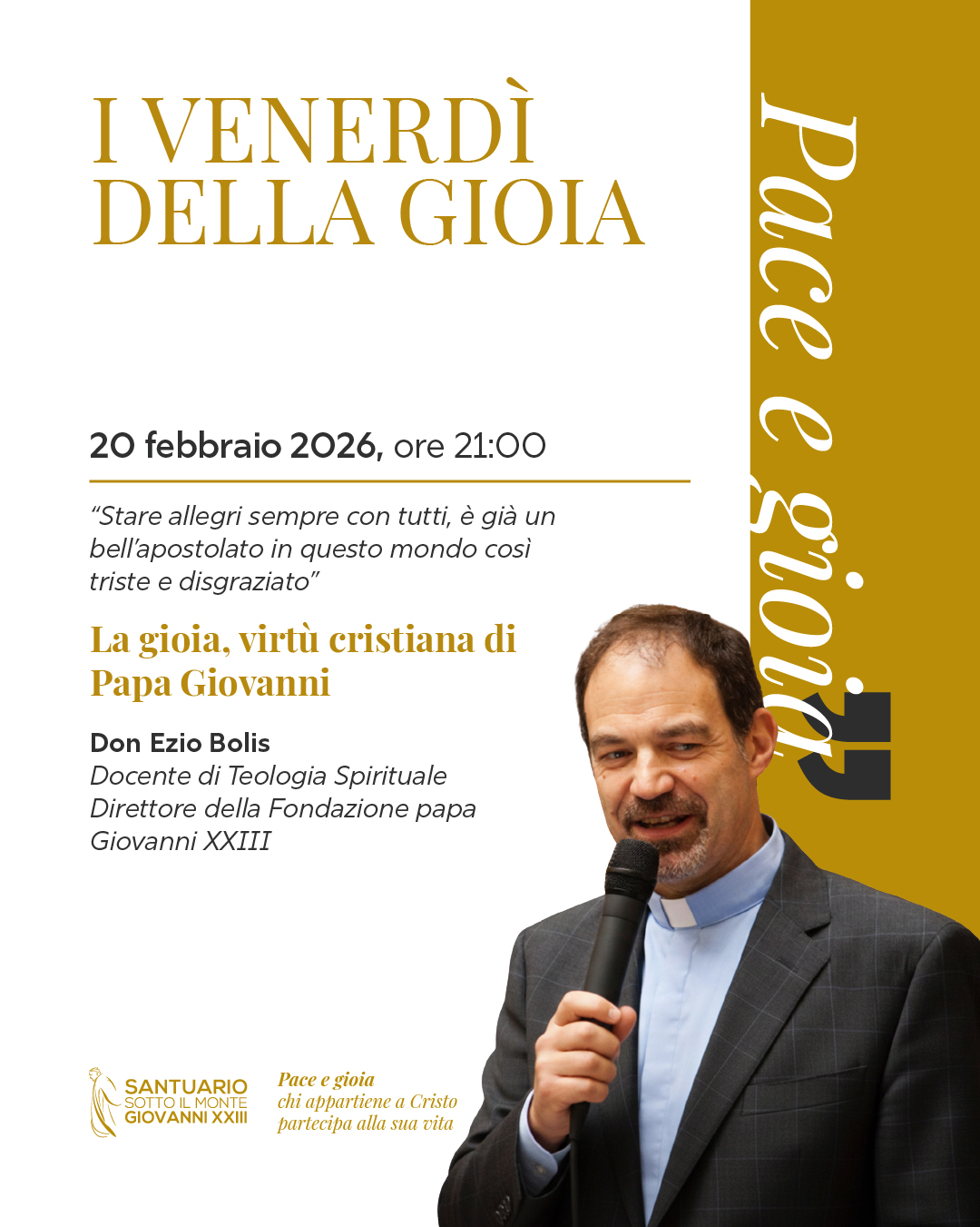 “Iniziare il cammino dei Venerdì della Gioia con don Ezio Bolis significa tornare alla radice della gioia cristiana, così come papa Giovanni l’ha vissuta e insegnata. Non una gioia superficiale o evasiva, ma quella che nasce dall’incontro con il Signore e che, giorno dopo giorno, sostiene la vita, illumina le relazioni e rende possibile la speranza. Il nostro Vescovo, mons. Francesco Beschi, ci invita a camminare sotto il segno della gioia. Come Santuario sentiamo questa chiamata rivolta non solo alla nostra comunità, ma anche ai pellegrini che qui sostano e cercano un tempo di silenzio e di preghiera. La gioia cristiana è un dono che si riceve nell’incontro con il Signore, ma è anche una responsabilità che siamo chiamati a custodire e testimoniare. Papa Giovanni ci ha mostrato che si può attraversare la storia con mitezza e fiducia, facendo della serenità un vero apostolato. Come Santuario desideriamo offrire luoghi e momenti in cui questa gioia possa essere meditata, pregata e condivisa, perché diventi stile concreto di vita per chi viene a sostare qui e per la nostra comunità.” aggiunge invece Monsignor Giulio Albani, Rettore e Parroco di Sotto il Monte.